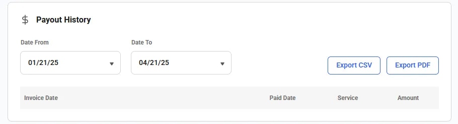 You can view your payout history for a selected date range. Here you can generate and download invoices for your earning payouts.