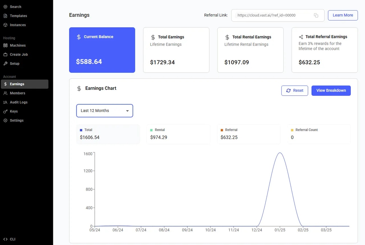 - Total Rental Earnings (host only): This shows the total lifetime amount you’ve earned from your machine being rented out on the platform.